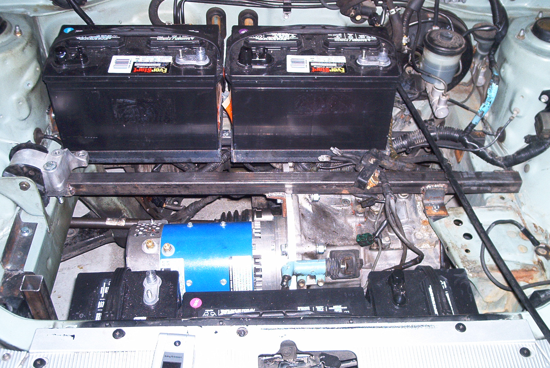 I decided to go with a DC motor again but this time rated at 72-120 volts. I experimented with various battery configurations and voltages but settled on thirteen 6 volt deep cycle batteries for a system voltage of 78. Storing 13 large batteries in a small Tercel was not an easy task. I built a box to store 8 batteries in the trunk and the remainder were stored in the engine compartment.